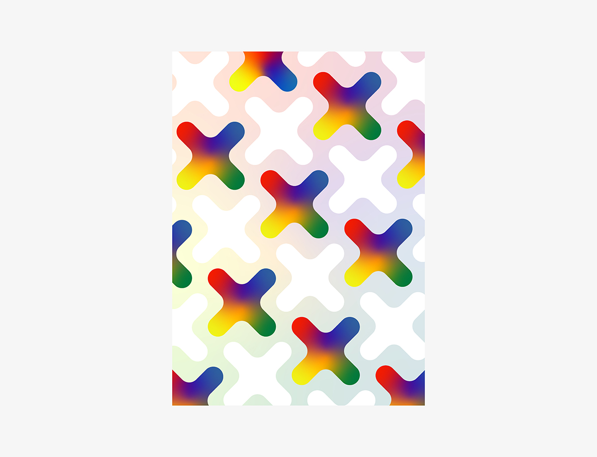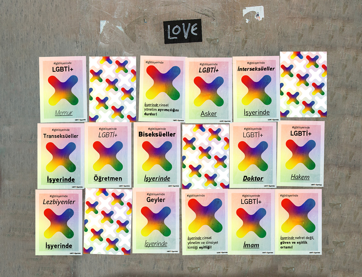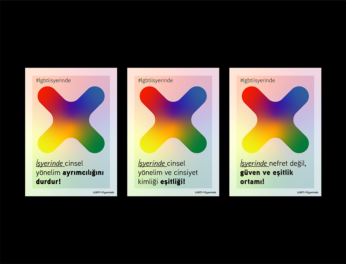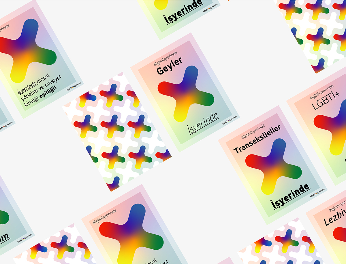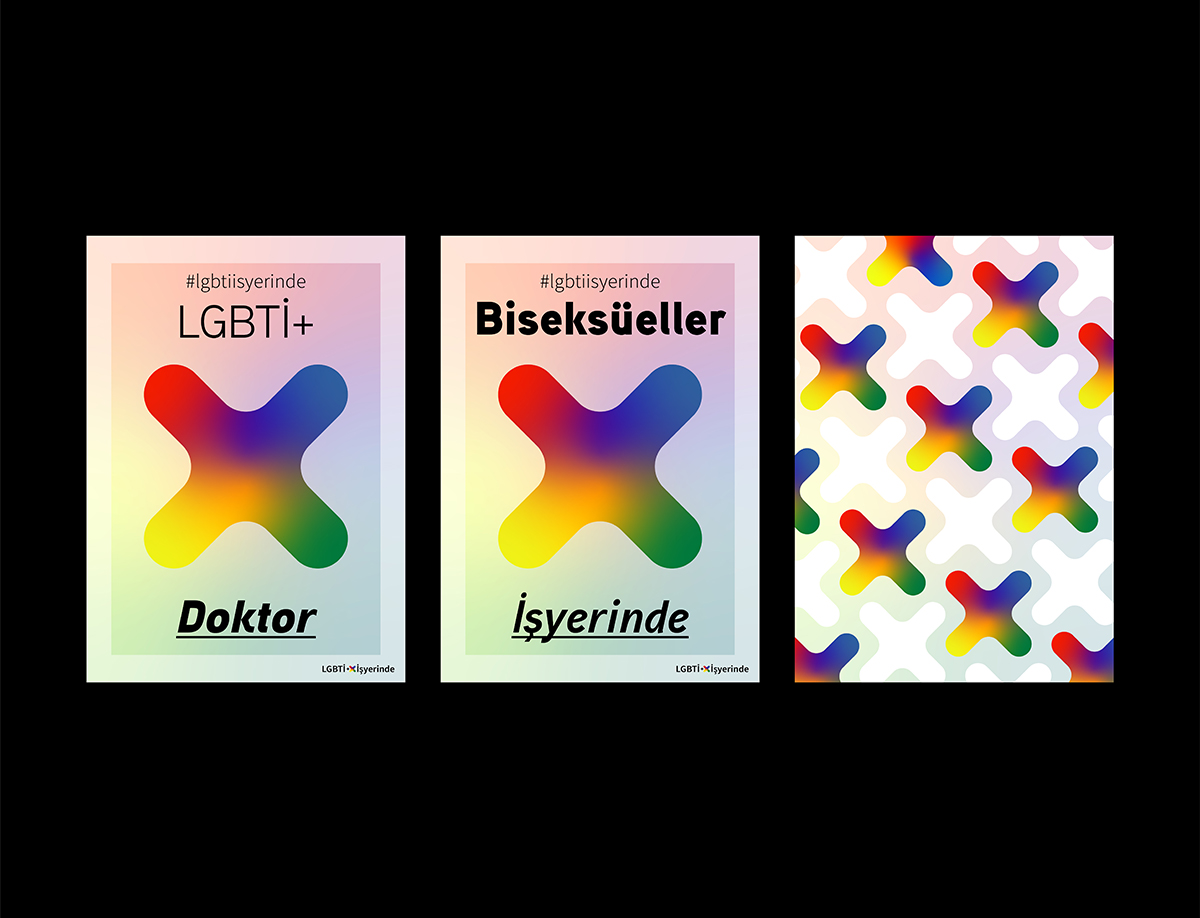 In the signature for the poster series, alongside plus sign is used the tilted and bigger version of it as a main graphic element. And these two graphic elements fit each other to deliver the feeling of inclusion and connection in between LGBTI+ people and the workplaces.