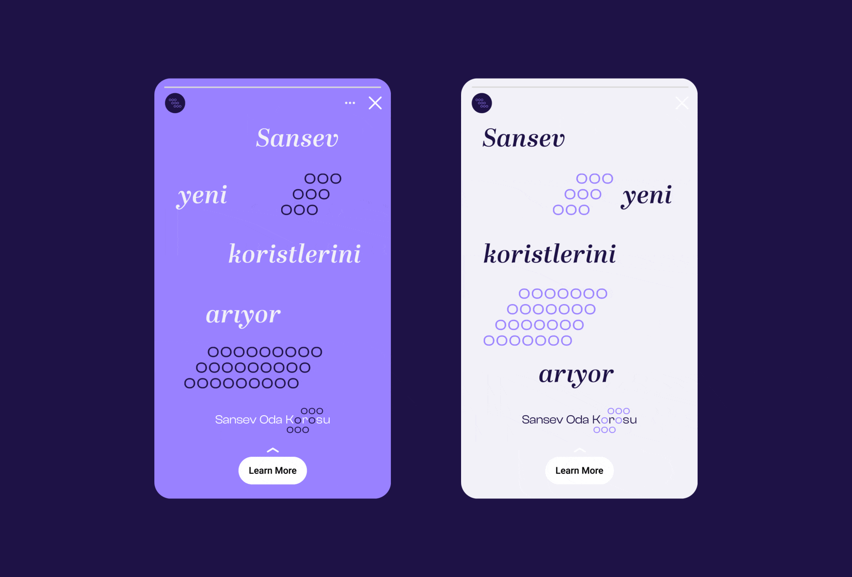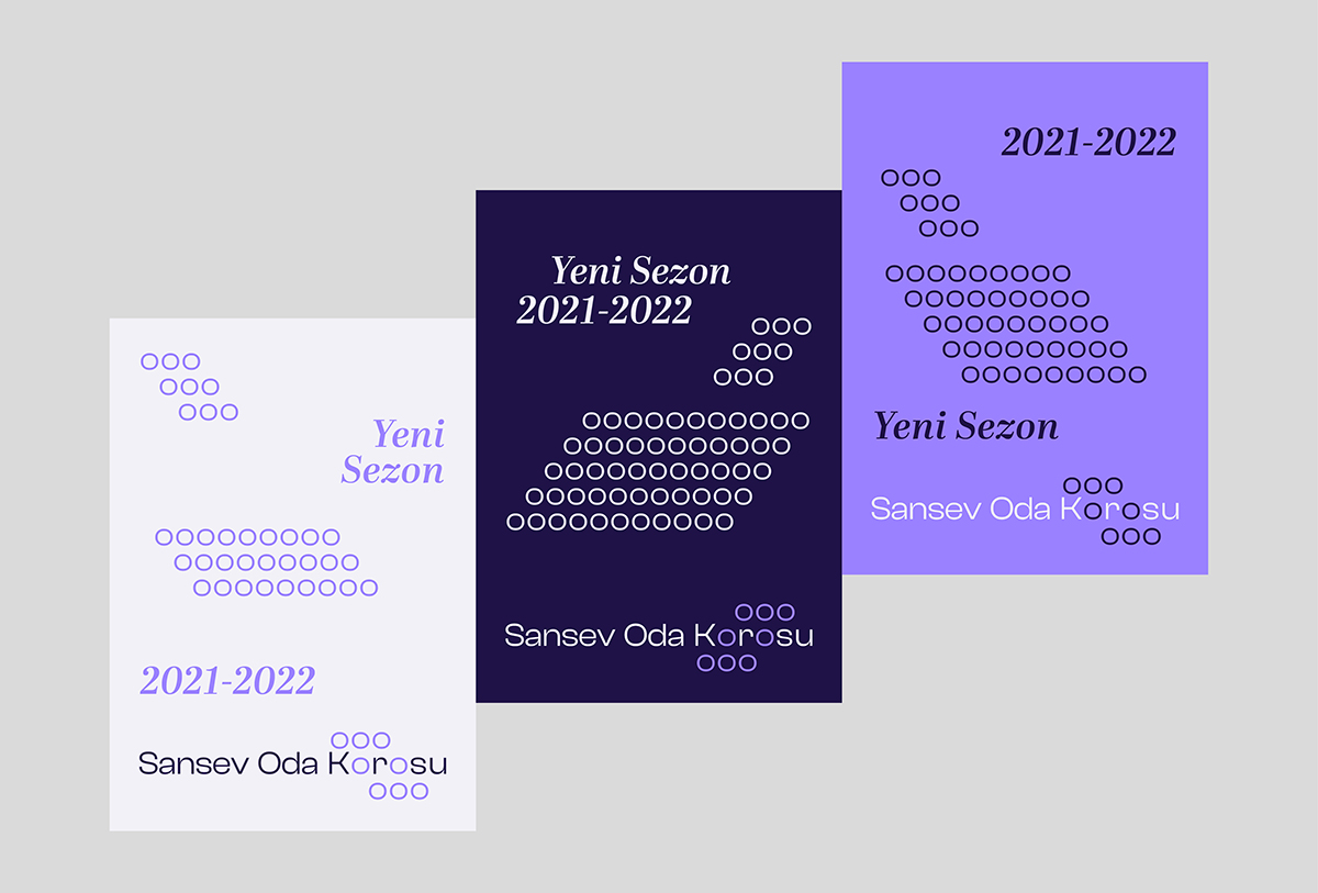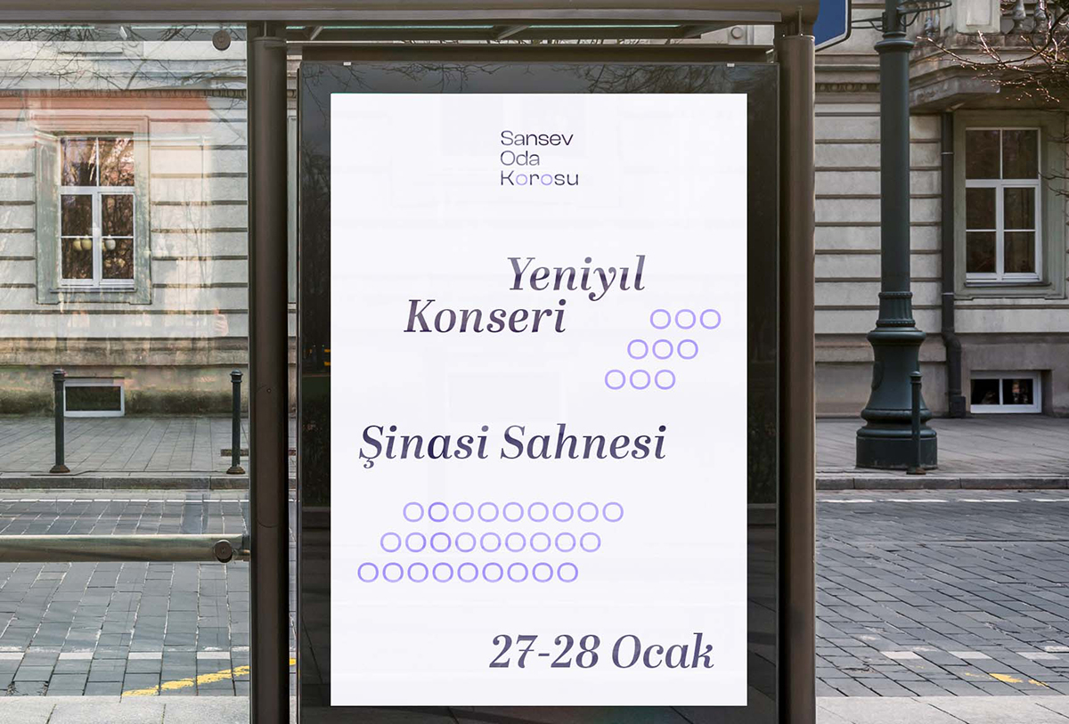 Sansev Oda Korosu is a choir residing in Istanbul whose members are of all ages and occupations. The visual identity for Sansev Oda Korusu reflects and uses the array of chorists and listeners represented as lower-case o's as the main graphic elements.