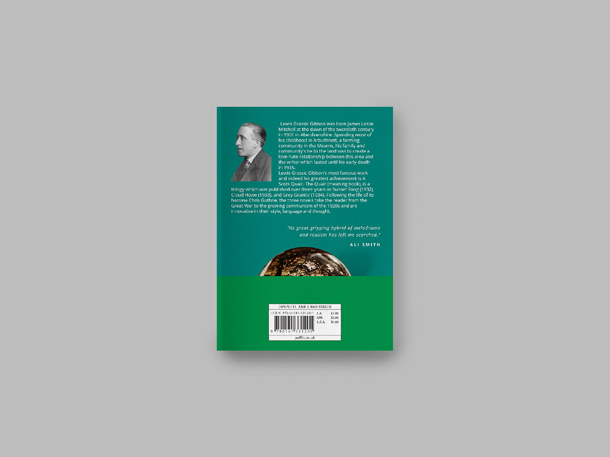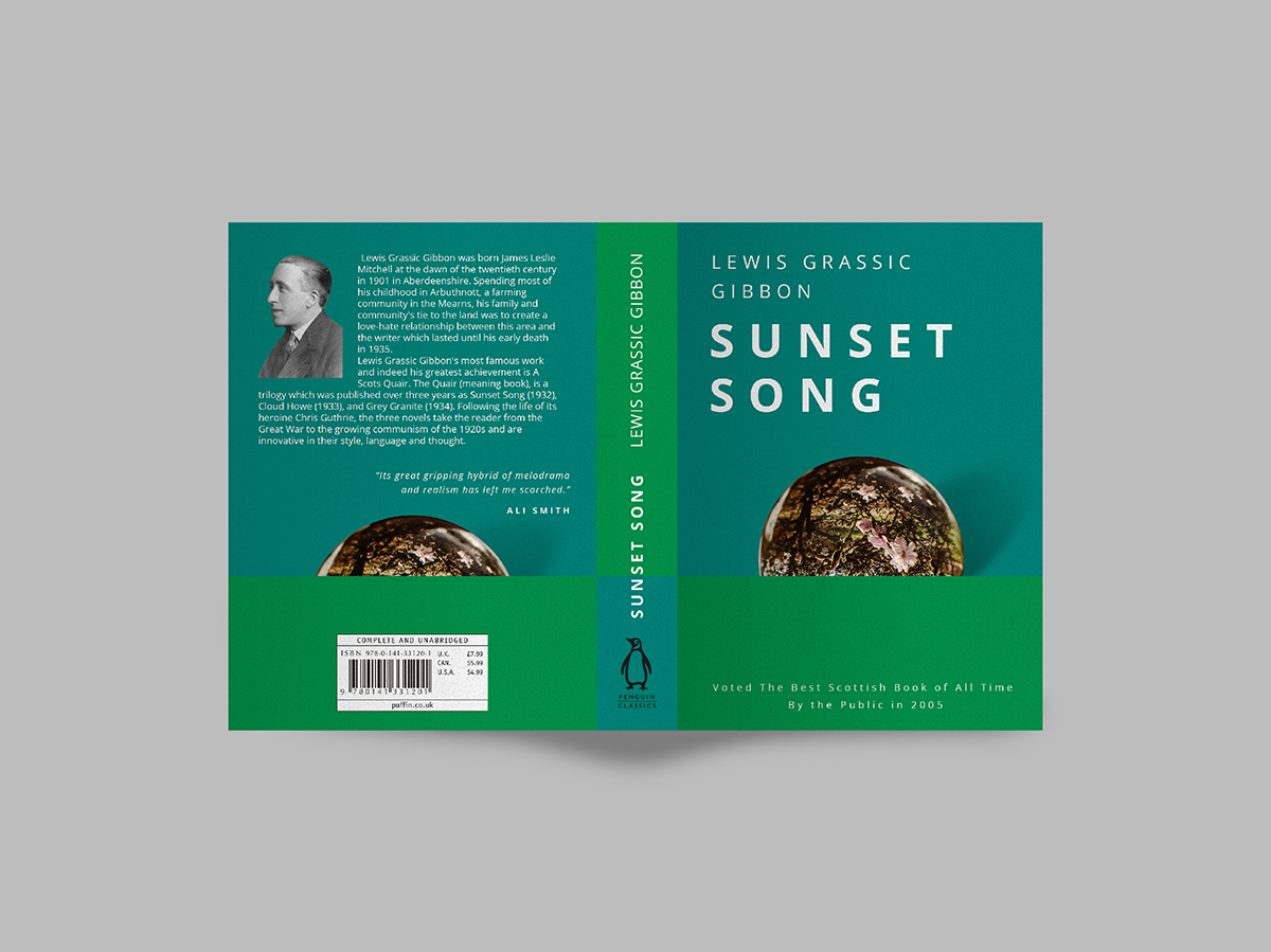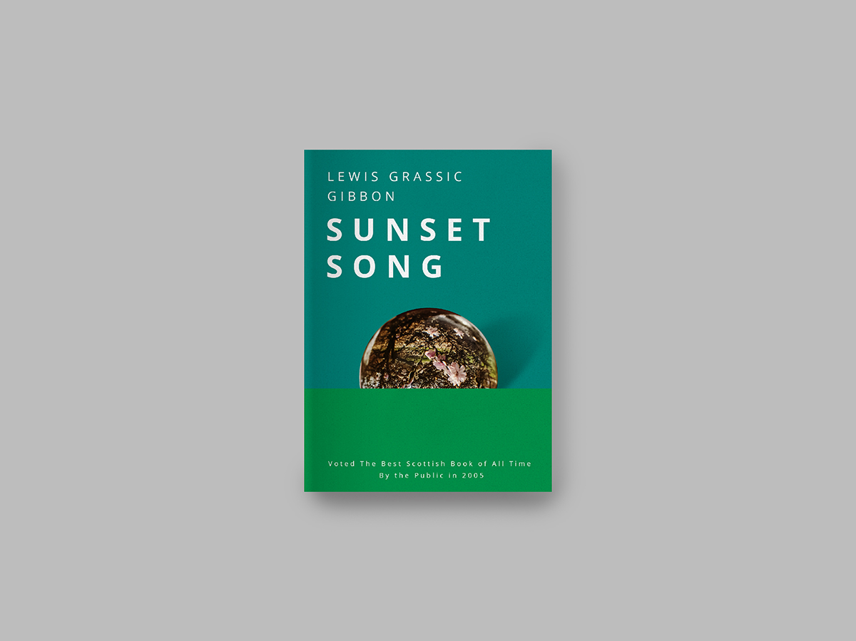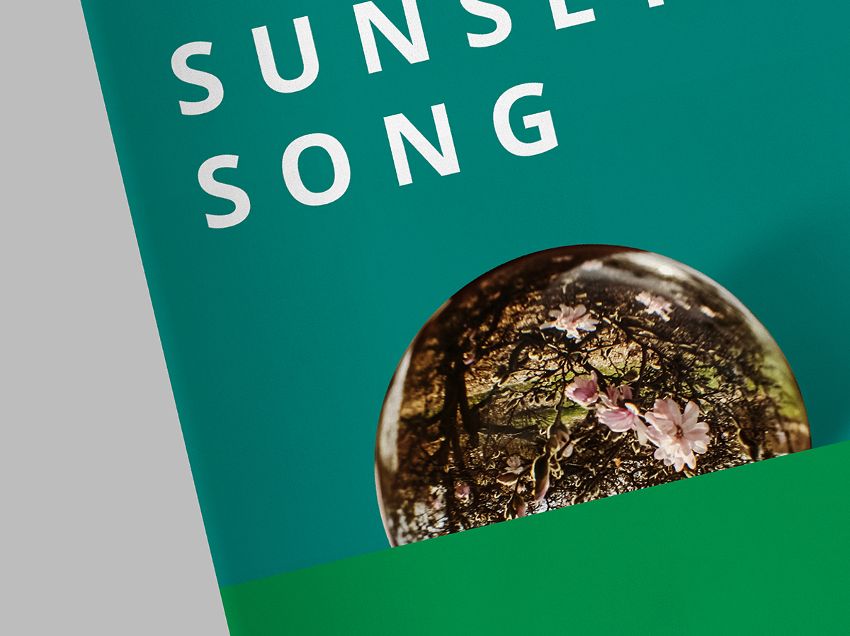 The book cover is a direct reference to how the plot of the book had been ended, setting sun above the farmland while the Scottish folk tune “Flowers of the Forest” being sung. The opaque sun reflecting the farmlands of Scotland placed on the horizon formed by solid color blocks of green utilized on the cover with the purpose of giving the viewers a glimpse of where the story was set overall.