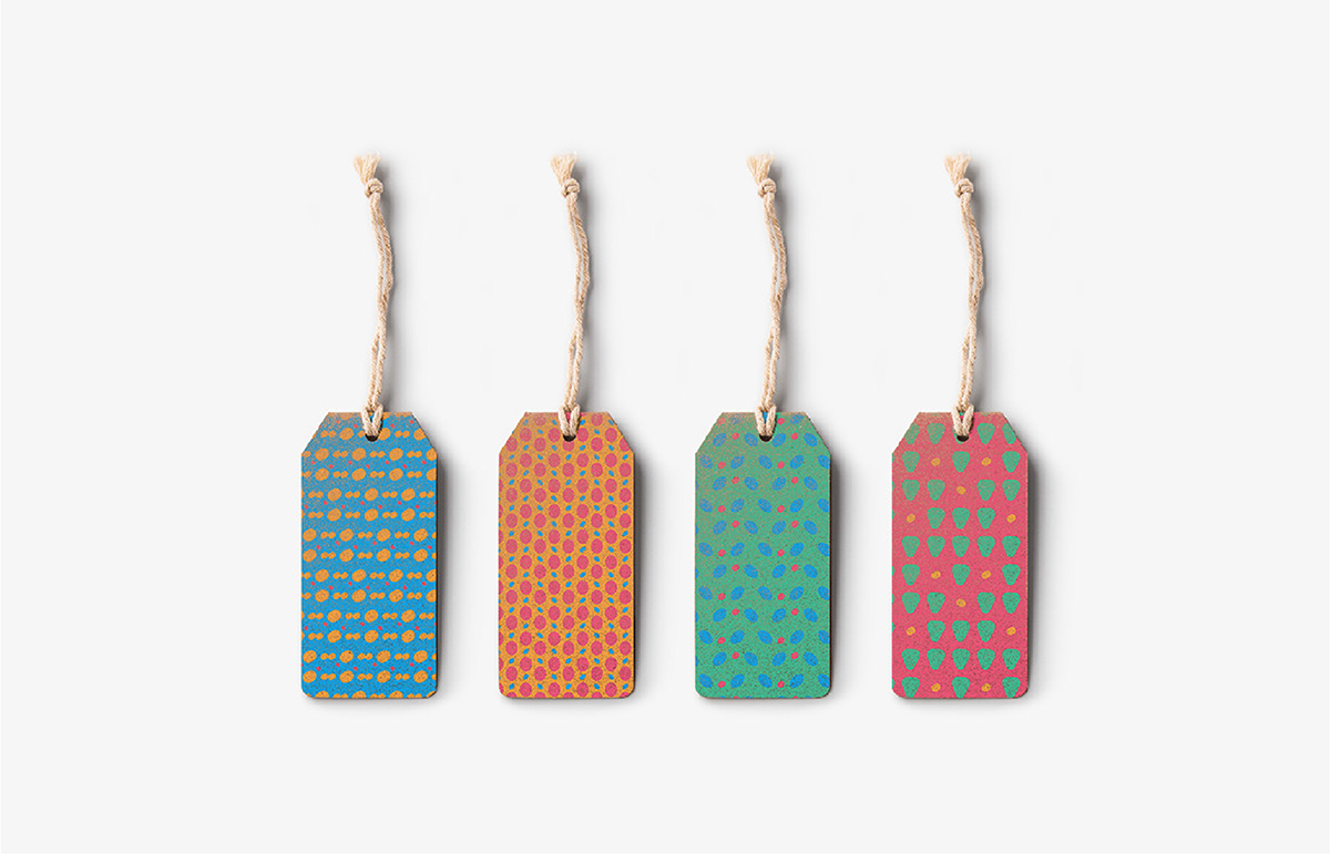 The design of logo symbolizes the participation of children in the process of making handcrafted products and the joint work of themselves and their mothers through the handwritten letterforms 'd' and 'o' and it adds up to the playful and childish qualities that logo has. The letter 'o' in the shape of heart also celebrates the brand name. The color scheme is inspired by the middle-east region from which all the refugee mothers and children are. The identity also uses different versions of hand-drawn patterns inspired by the logo and the drawings of kids as visual elements.